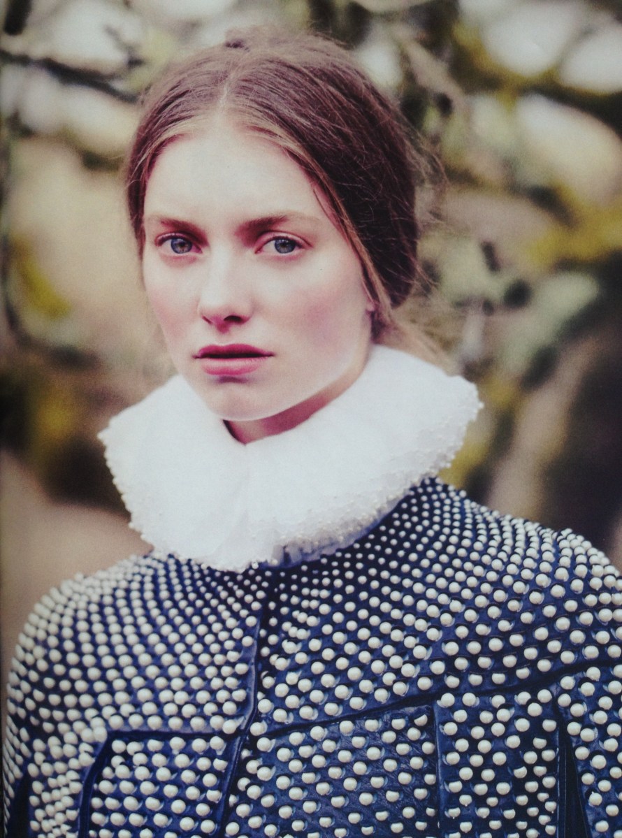 ‘Dark Star’ editorial, Harper’s Bazaar UK, September 2013. Styled by Cathy Kasterine, photographs Tom Allen, model Iris Van Berne. Leather coat with pearls, chiffon and organza shirt with pearls, both Alexander McQueen.